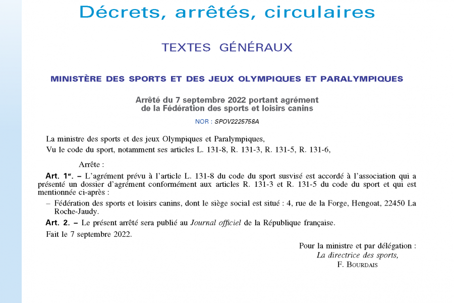 Votre fédération qui bénéficie de l’agrément ministériel répond aux évolutions du Code Du Sport.